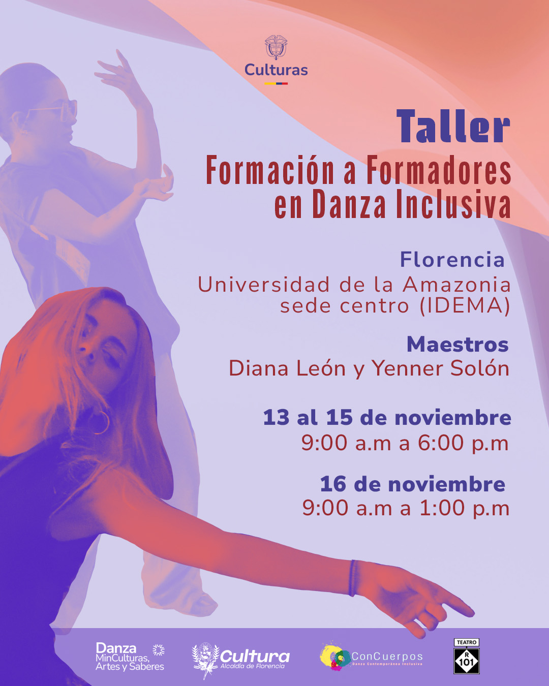 maestros, formadores, coreógrafos, directores de agrupaciones y líderes de procesos de danza o artes escénicas, con y sin discapacidad, interesados en indagar y actualizar herramientas de creación, expresión y formación en el trabajo con población con discapacidad, de los Departamentos del Norte de Santander y Florencia.