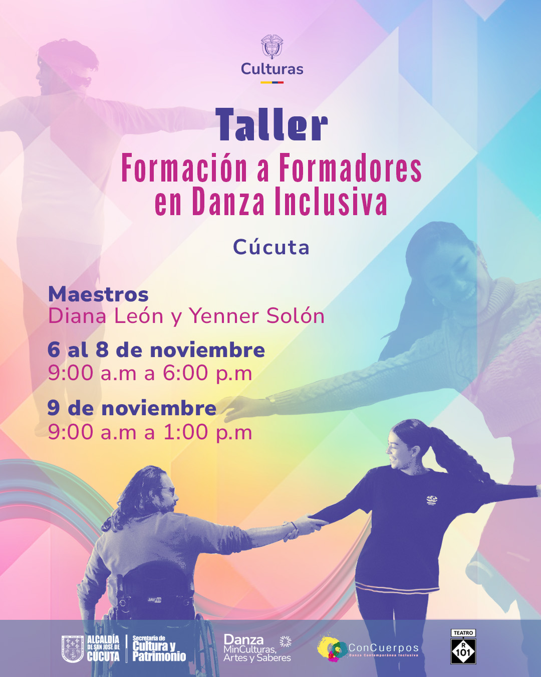 TALLERES "Formación a Formadores en Danza Inclusiva"Una iniciativa del Ministerio de las Culturas, las Artes y los Saberes, orientado por profesionales de la Corporación ConCuerpos de Bogotá y Estímulos Ceartes de Cali, con el apoyo de la Secretaria de Cultura y Patrimonio de Cúcuta y la Secretaría de Cultura, Deporte y Recreación de la Alcaldía de Florencia.Talleres de formación a formadores en Danza Inclusiva, con una duración de 34 horas (28 horas de trabajo presencial y 6 horas de trabajo individual previo) cada uno, liderados por expertos de las compañías ConCuerpos (Bogotá) y Estímulos Ceartes (Cali). El taller ofrece diversos recursos pedagógicos y reflexiones filosóficas que nutren procesos de danza y artes escénicas donde participan Personas con Discapacidad (PCD). ConCuerpos apo ...